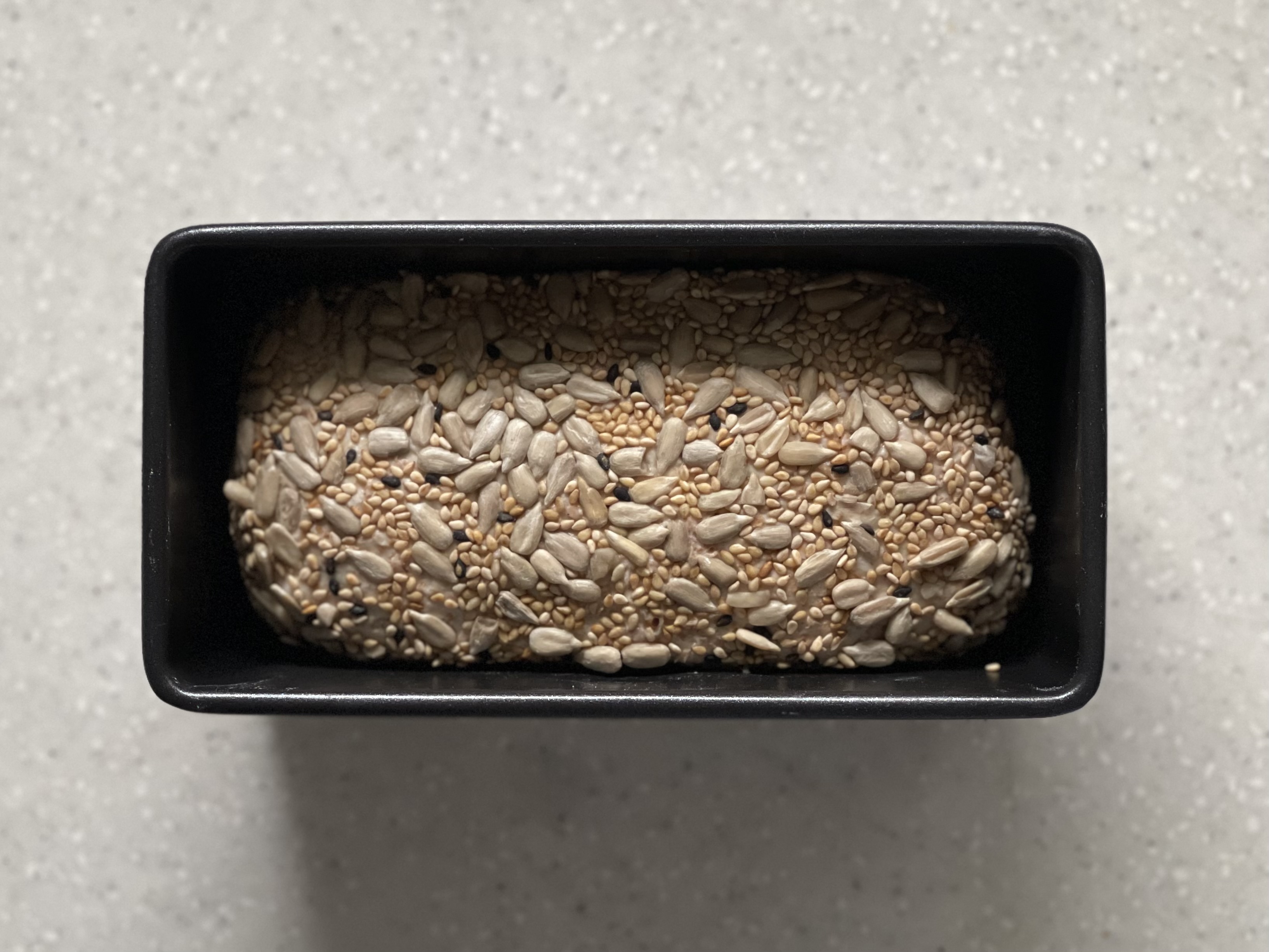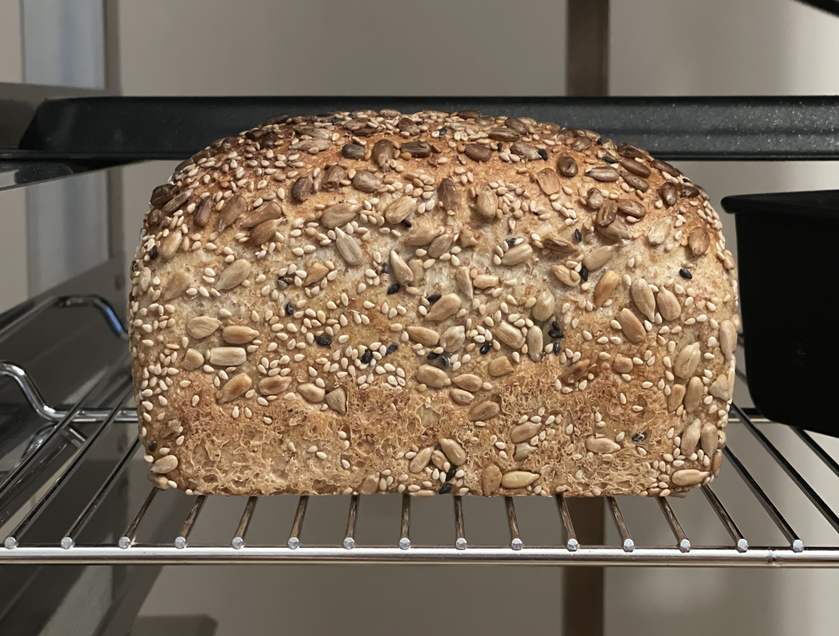 반죽 온도와 믹싱, 발효 시간을 조정하며 세 번째 도전을 했다. 쿠프가 얕게 들어간 건 아쉽지만 볼륨은 확실히 개선되었다. 식빵 틀에 굽는 경우 씨앗이 타지 않도록 호일을 덮어 구웠는데, 먹음직스럽게 잘 나왔다.