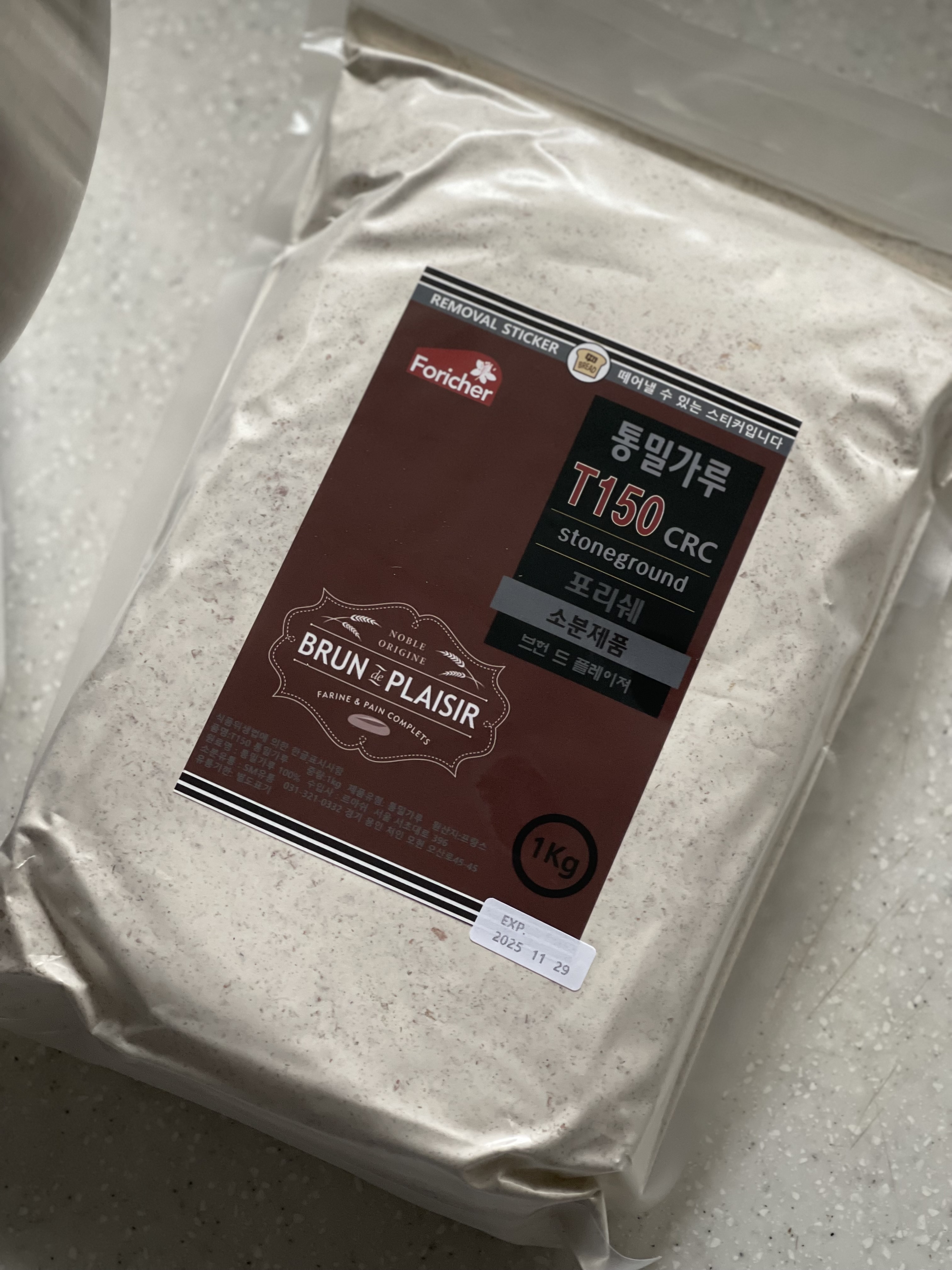 사용하는 밀가루는 프랑스 포리쉐 밀 중 가장 굵은 통밀 가루인 T150 Brun de plaisir. 이름은 ‘갈색의 즐거움’이라는 뜻인데, 들을 때마다 기분이 괜히 좋아진다. 구하기가 쉽지 않아 자주 굽지는 못하지만, 이번에 인당 2개 제한으로 구매할 수 있었고 정말 오랜만에 빵 꽁쁠레를 구워볼 수 있었다.