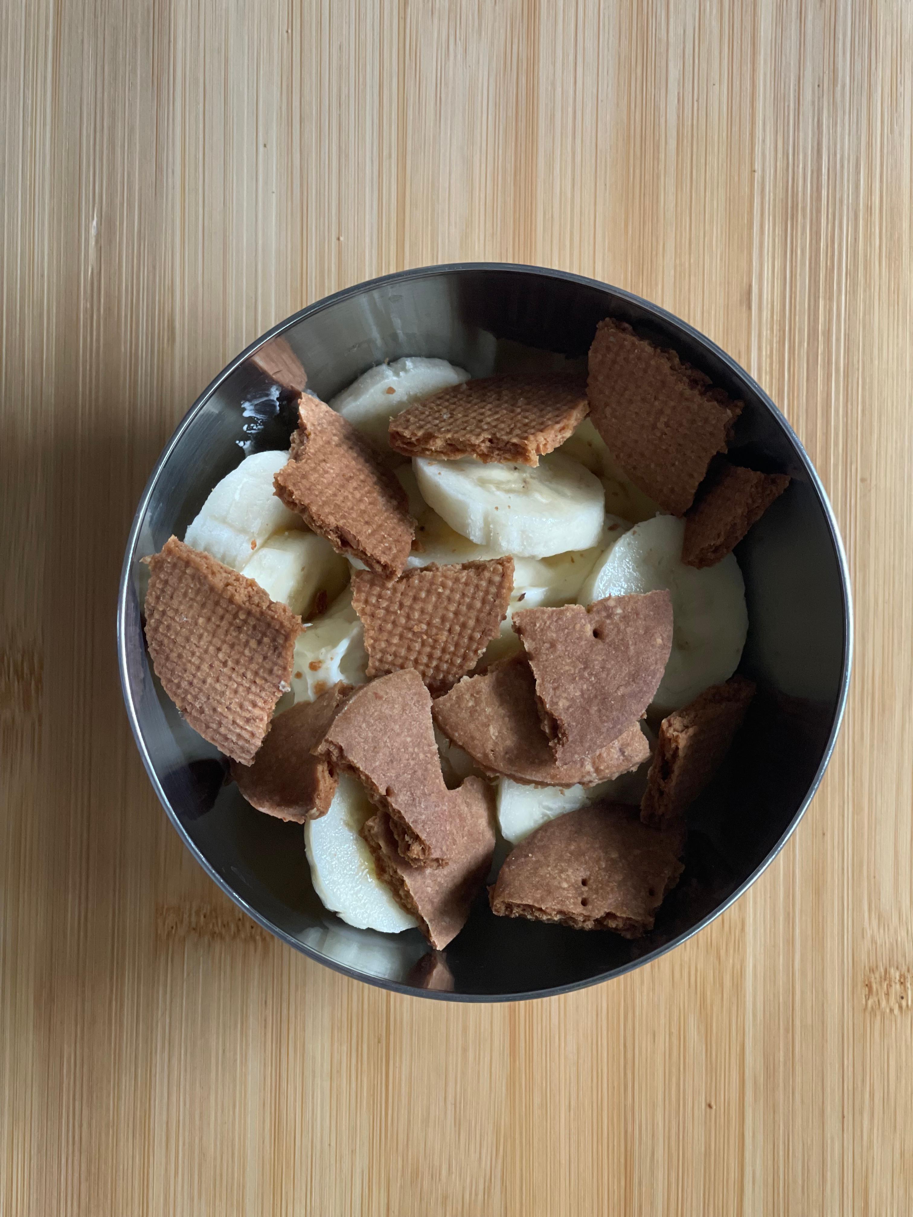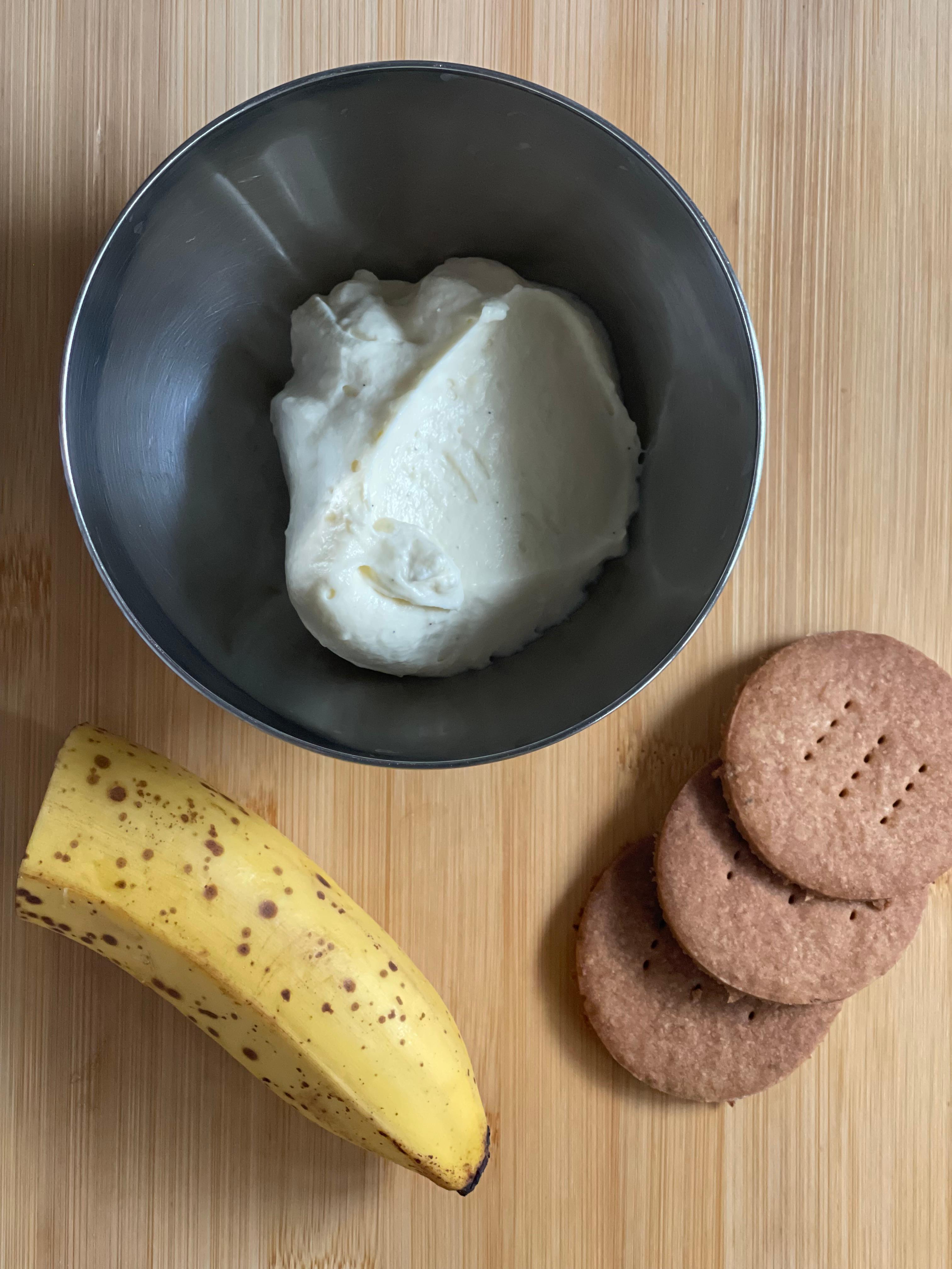디플로매트 크림 약 400g에 잘 익은 바나나 1개 반, 계란 쿠키 185g를 넣고 섞어준다. 쿠키는 작게 굽거나 3–4조각으로 부숴 넣으면 먹기 더 편했을 것 같다.