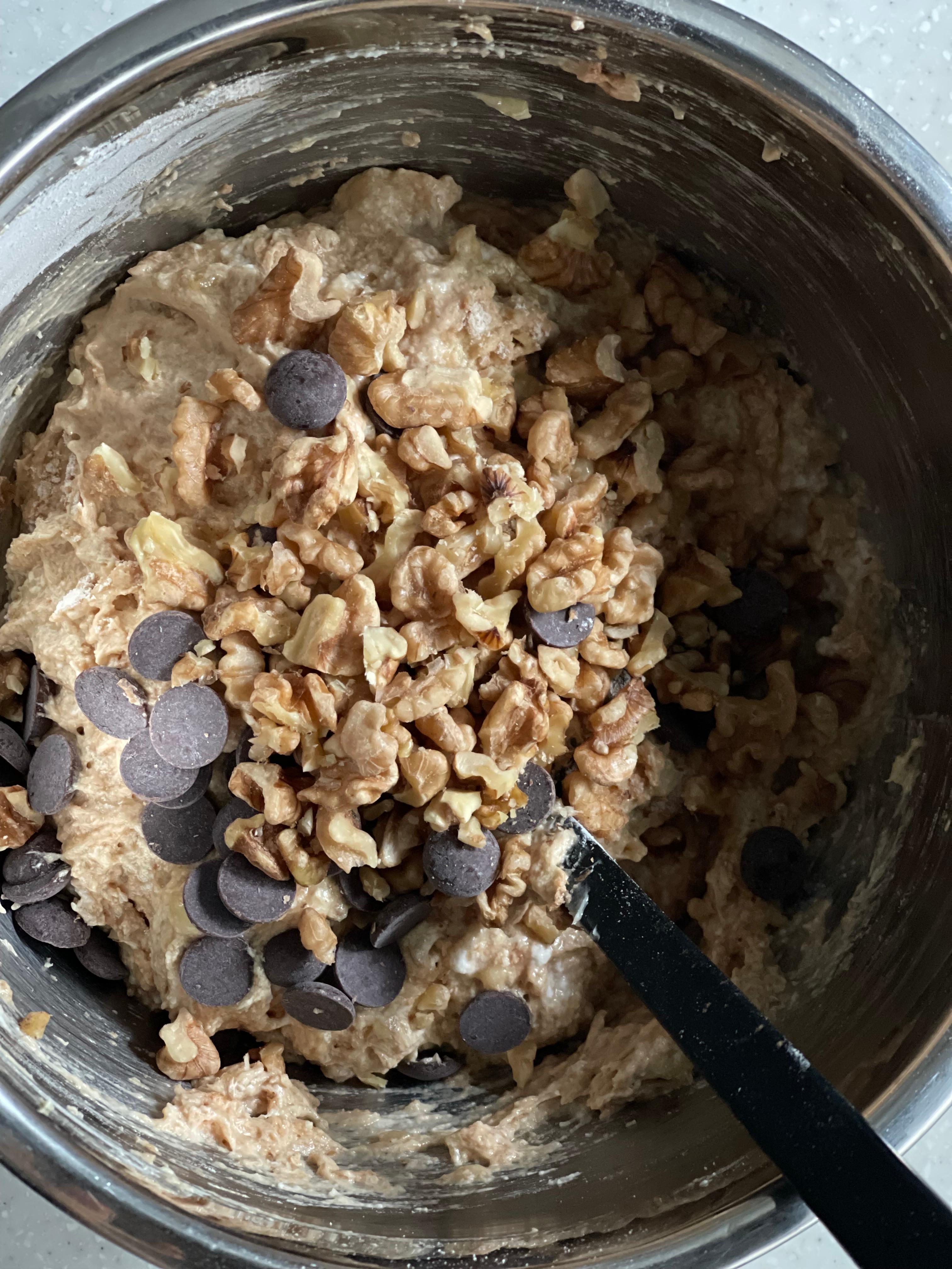 바나나가 들어가며 반죽이 다소 분리되었지만 레시피대로 신경 쓰지 않고 가루류를 체쳐 넣었다. 미리 구워 냉동해 두었던 호두와, 그 절반 분량인 다크 커버춰 25g을 넣었다. 가루가 다 섞이기 전 버터밀크를 넣어 대충 섞고, 호두와 초코칩까지 휘리릭 섞어 반죽을 완성했다.