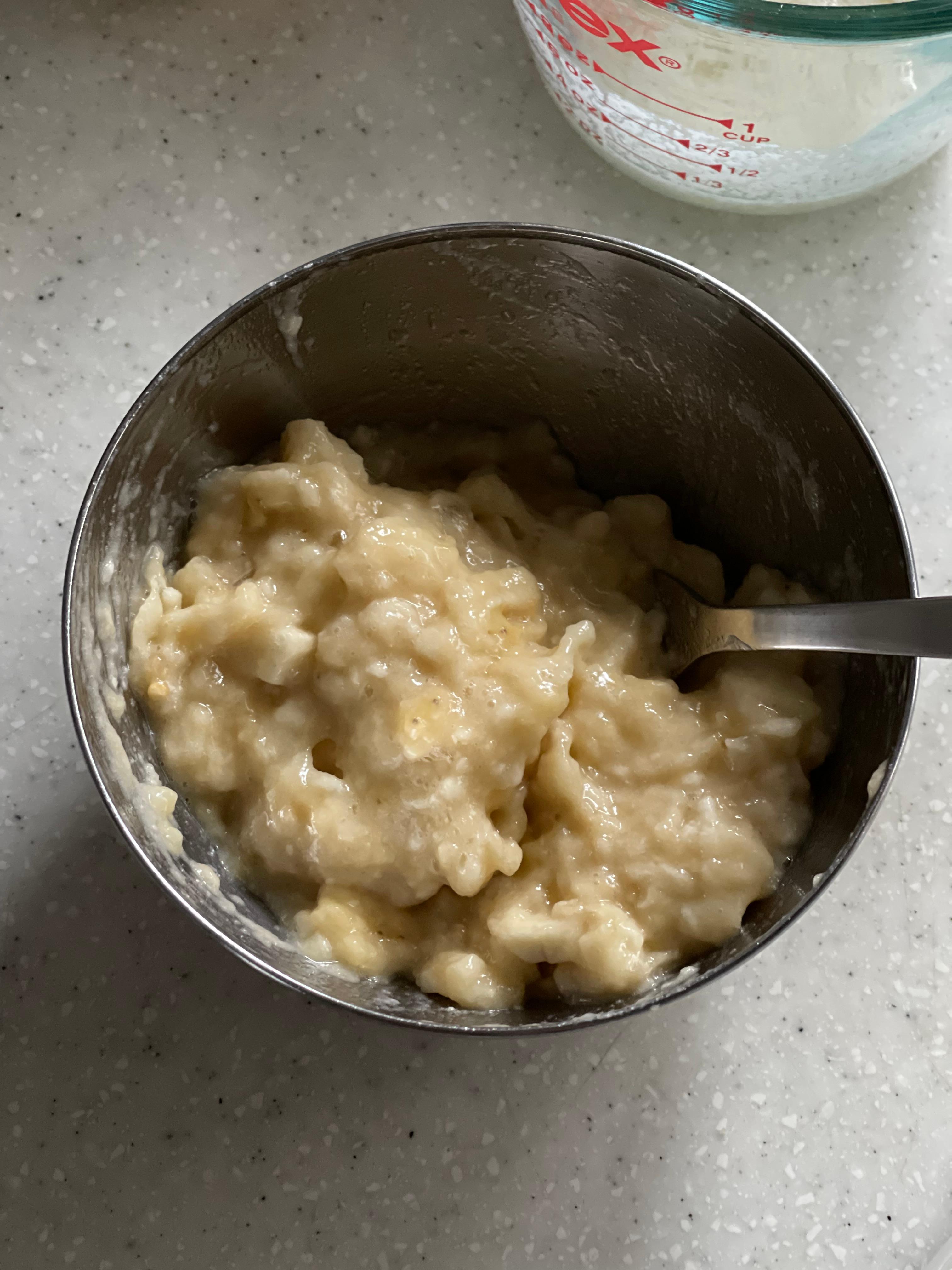이번에는 반배합으로 만들어 15cm 원형 팬에 구웠다. 완전히 후숙된 바나나는 아니었지만 요즘 바나나는 속이 금방 익어서 반죽에 쓰기에 충분했다. 버터는 앵커버터를 실온에 두어 사용했고, 계란은 대란 1개 반(약 75g), 작은 바나나는 2개 반을 넣었다. 버터밀크는 우유를 전자레인지에 20초간 데운 뒤 식초를 섞어 준비했다.