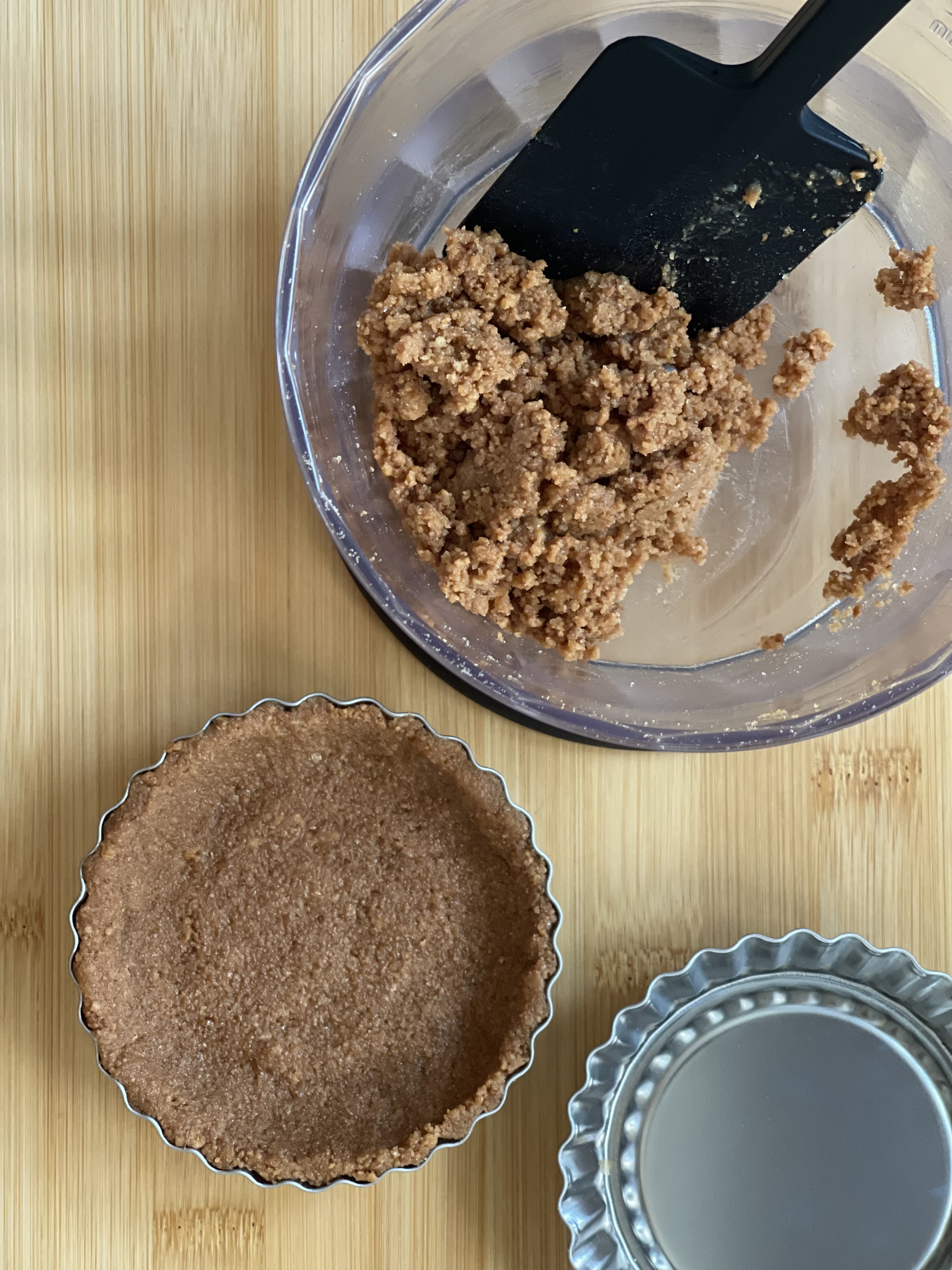 나는 지난번에 구워 냉동해 둔 다이제스티브 쿠키를 활용했다. 푸드프로세서에 갈아 녹인 버터와 설탕을 섞어 160도로 예열한 오븐에서 17분간 구웠다. 남은 생크림이 많지 않아 작은 타르트 틀 2개 분량으로 만들었는데, 꾹꾹 눌러 담아 꽤 두툼한 쿠키 파이가 되었다.