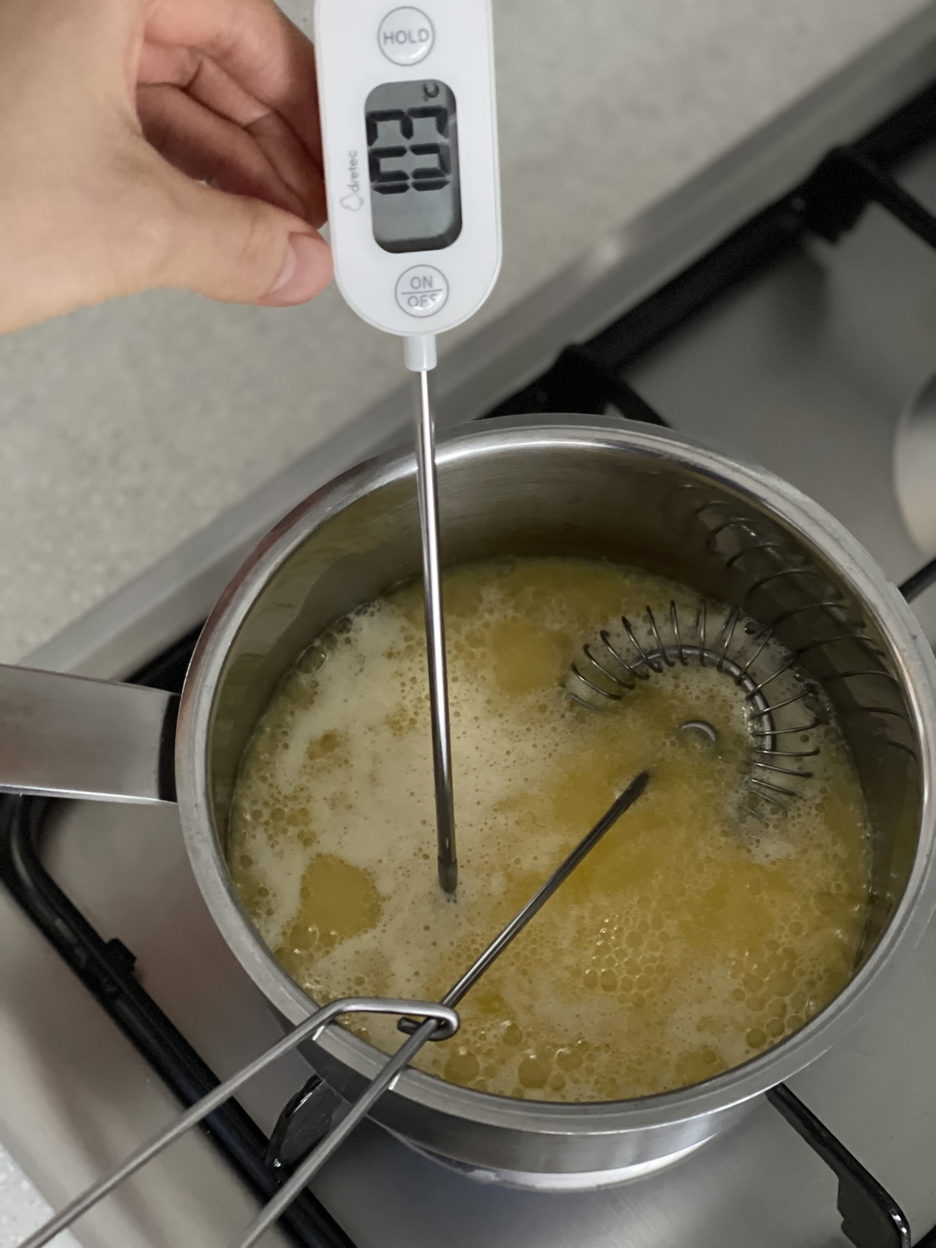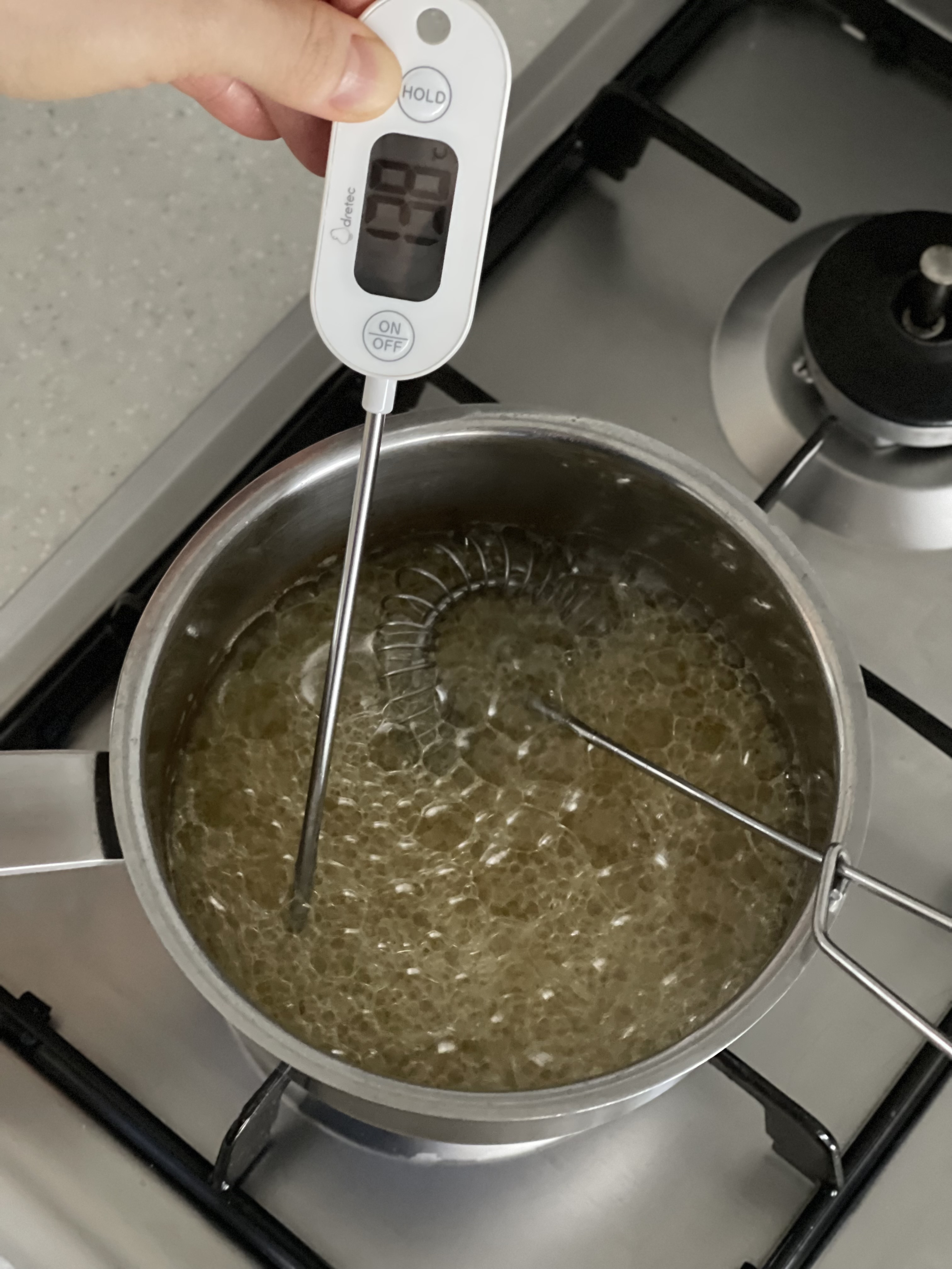 40~45도 정도로 따뜻하게 식힌 뒤 설탕 2종과 소금에 부어 섞는다.