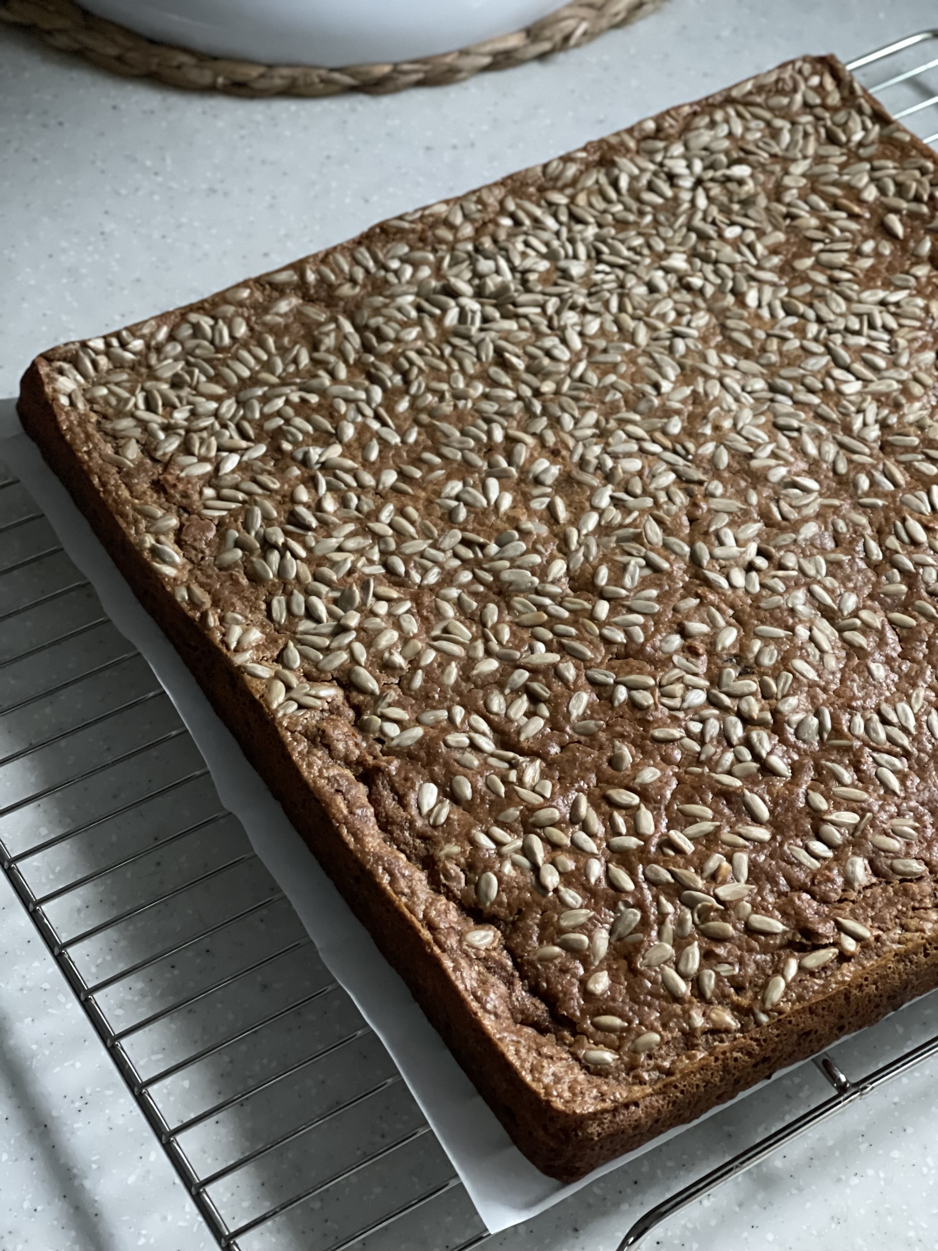 - 오일을 바른 팬에 반죽을 붓고, 윗면에 해바라기씨를 뿌린다.