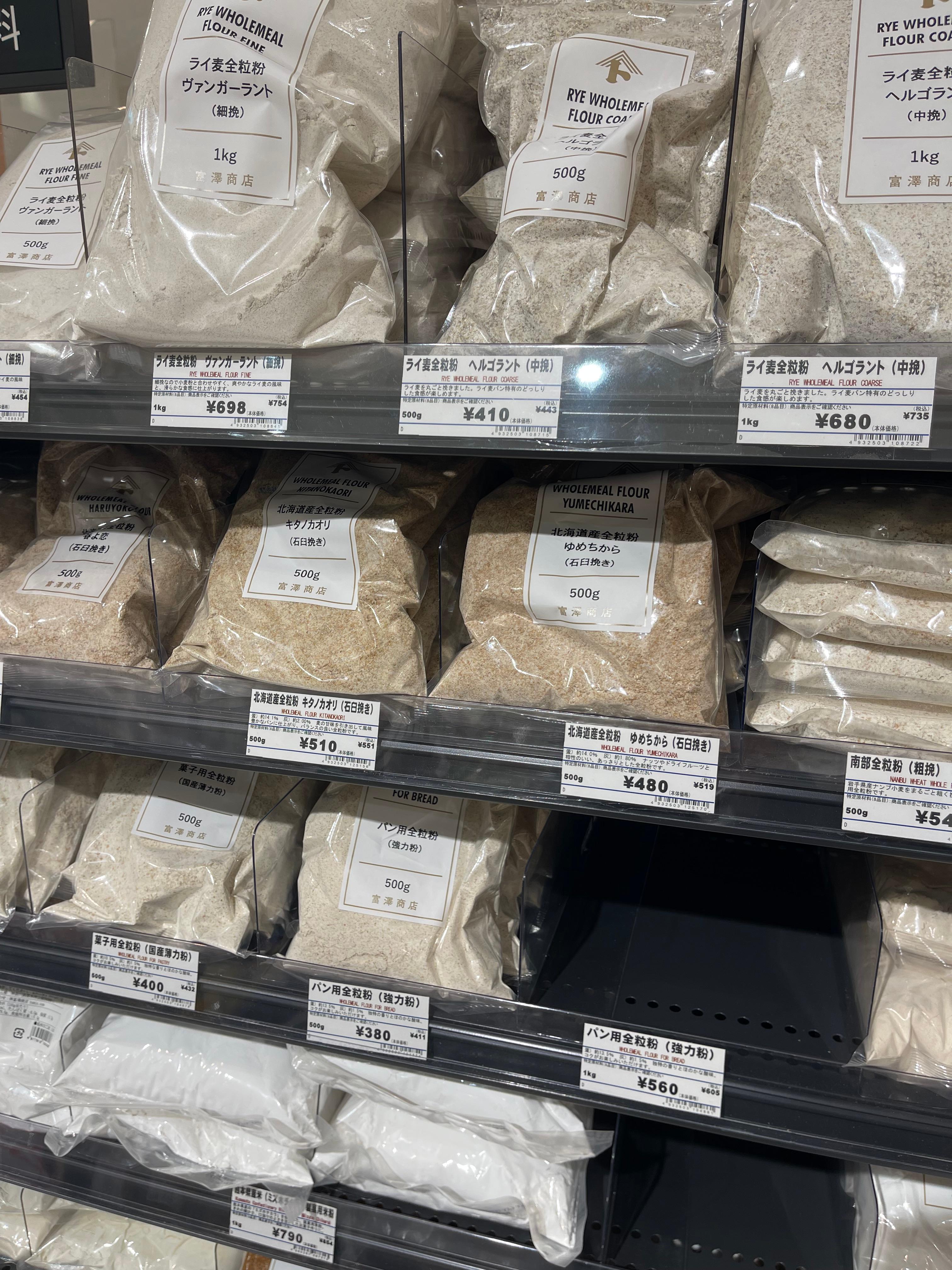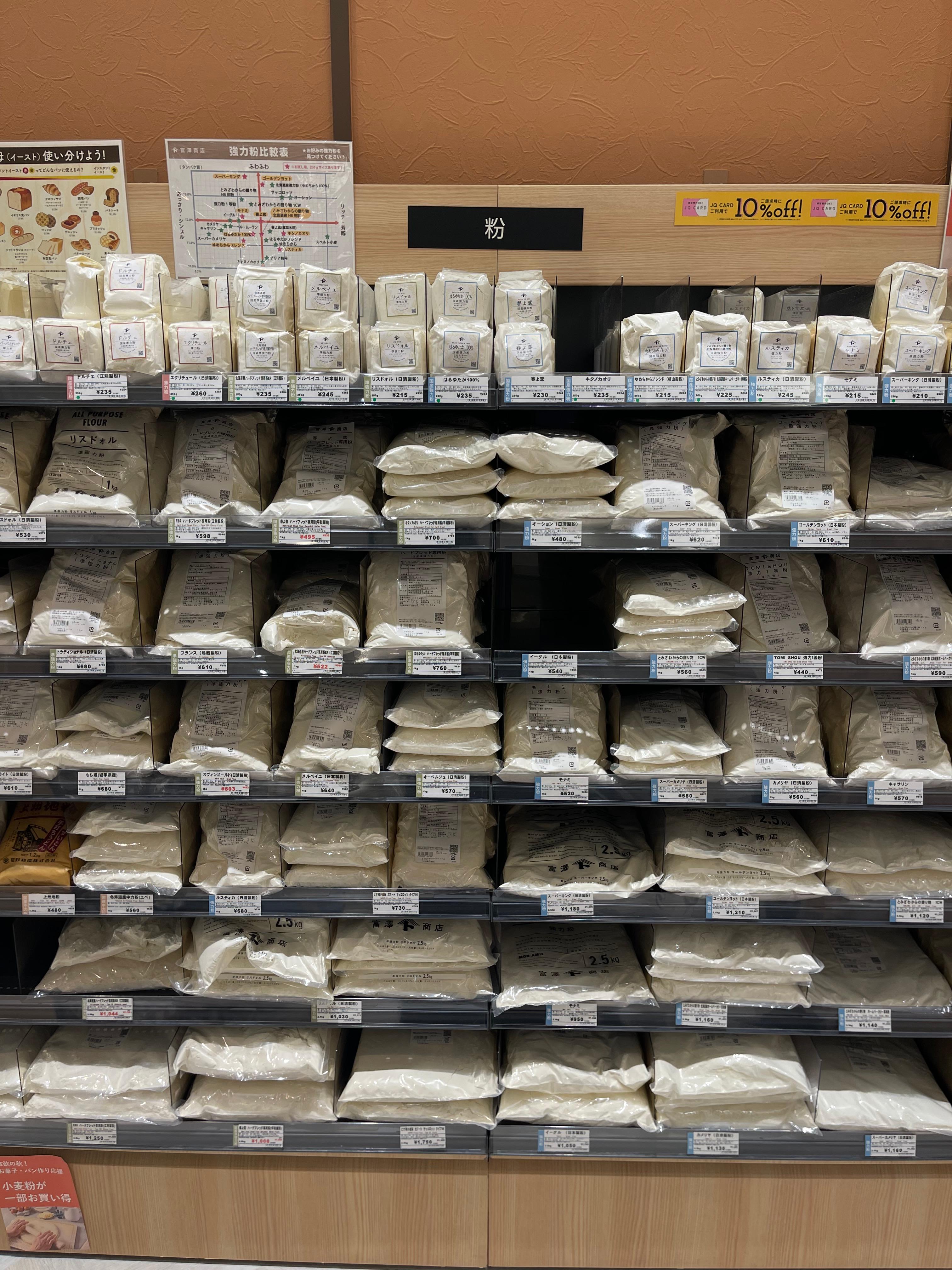 다양한 종류의 일본산 밀가루가 1kg 단위로 소포장되어 있어 하나씩 다 써보고 싶은 마음이 든다.