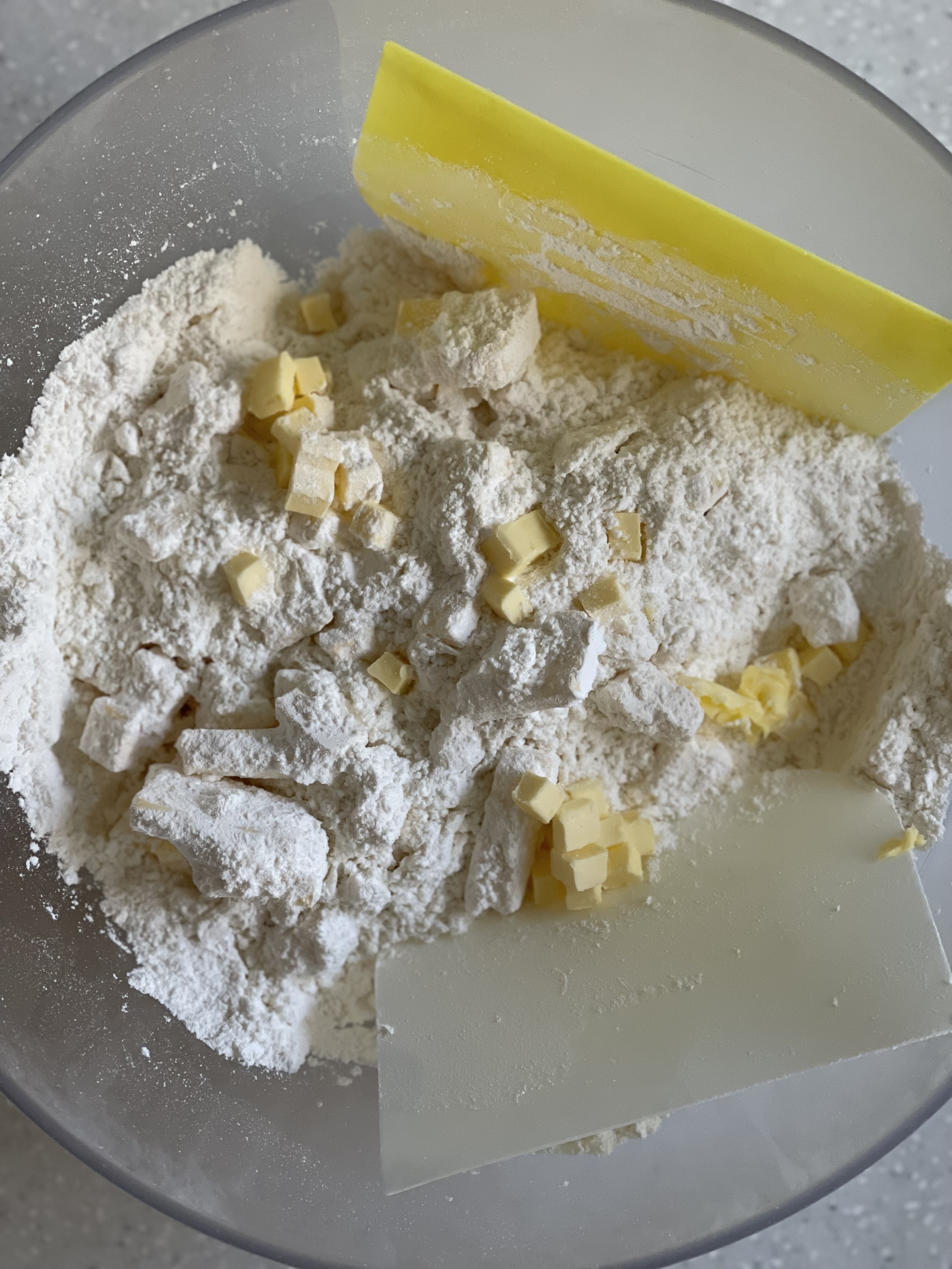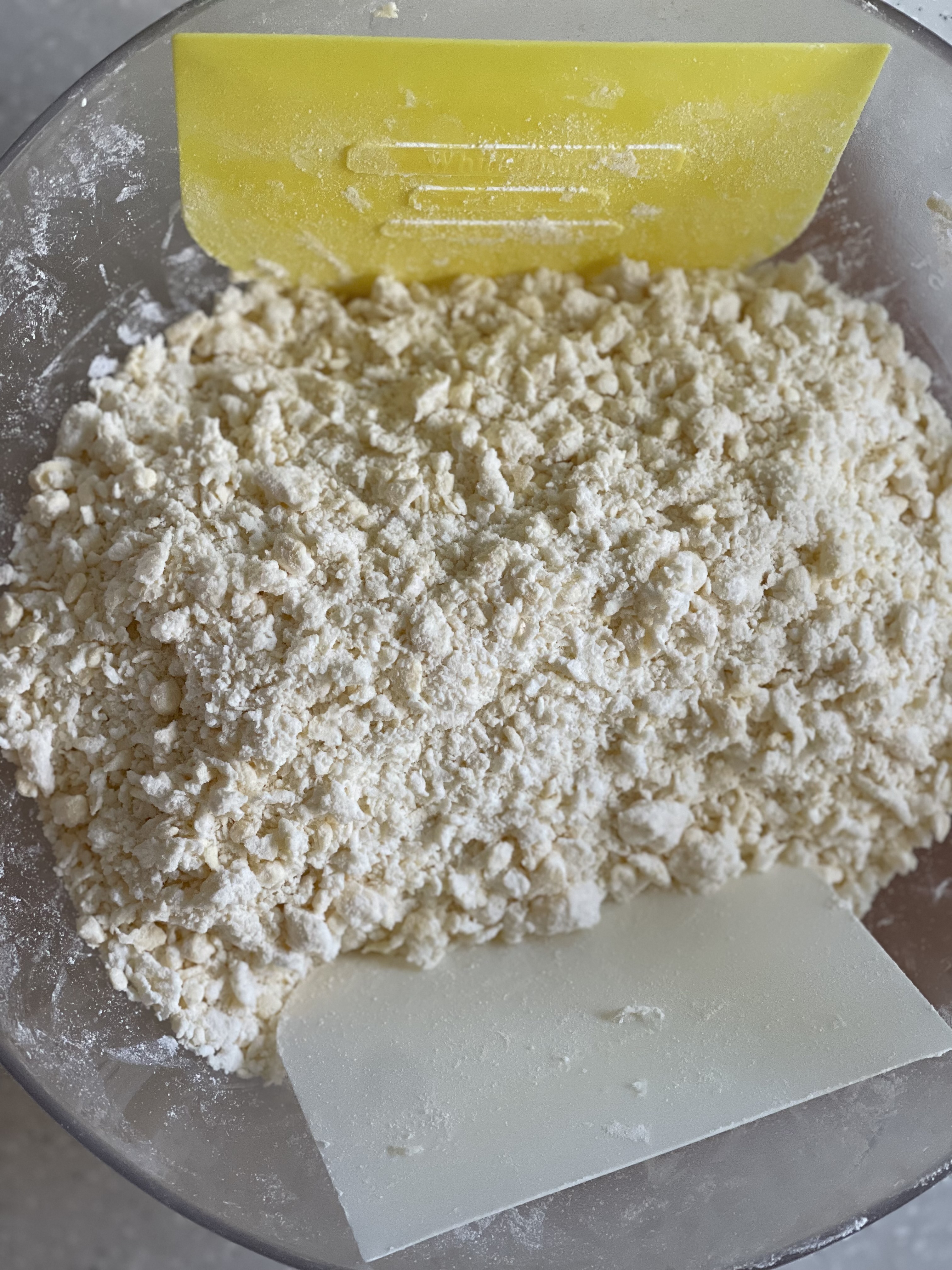 전날 밤 냉장고로 옮겨둔 생크림은 낮에 꺼냈을 때도 살얼음이 남아 있었다. 양이 많아 푸드프로세서는 사용하지 못하고 스크래퍼 두 개로 생크림을 잘게 다져 밀가루와 섞었다.