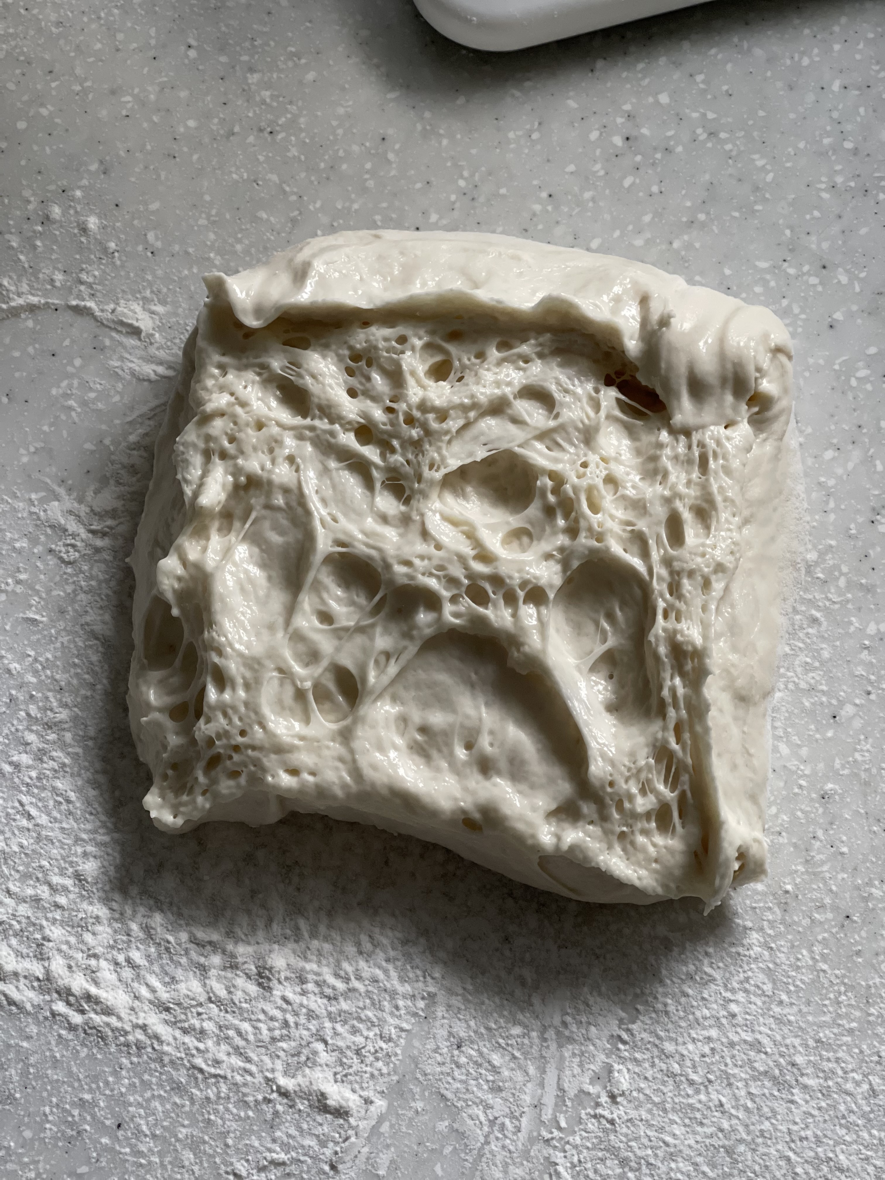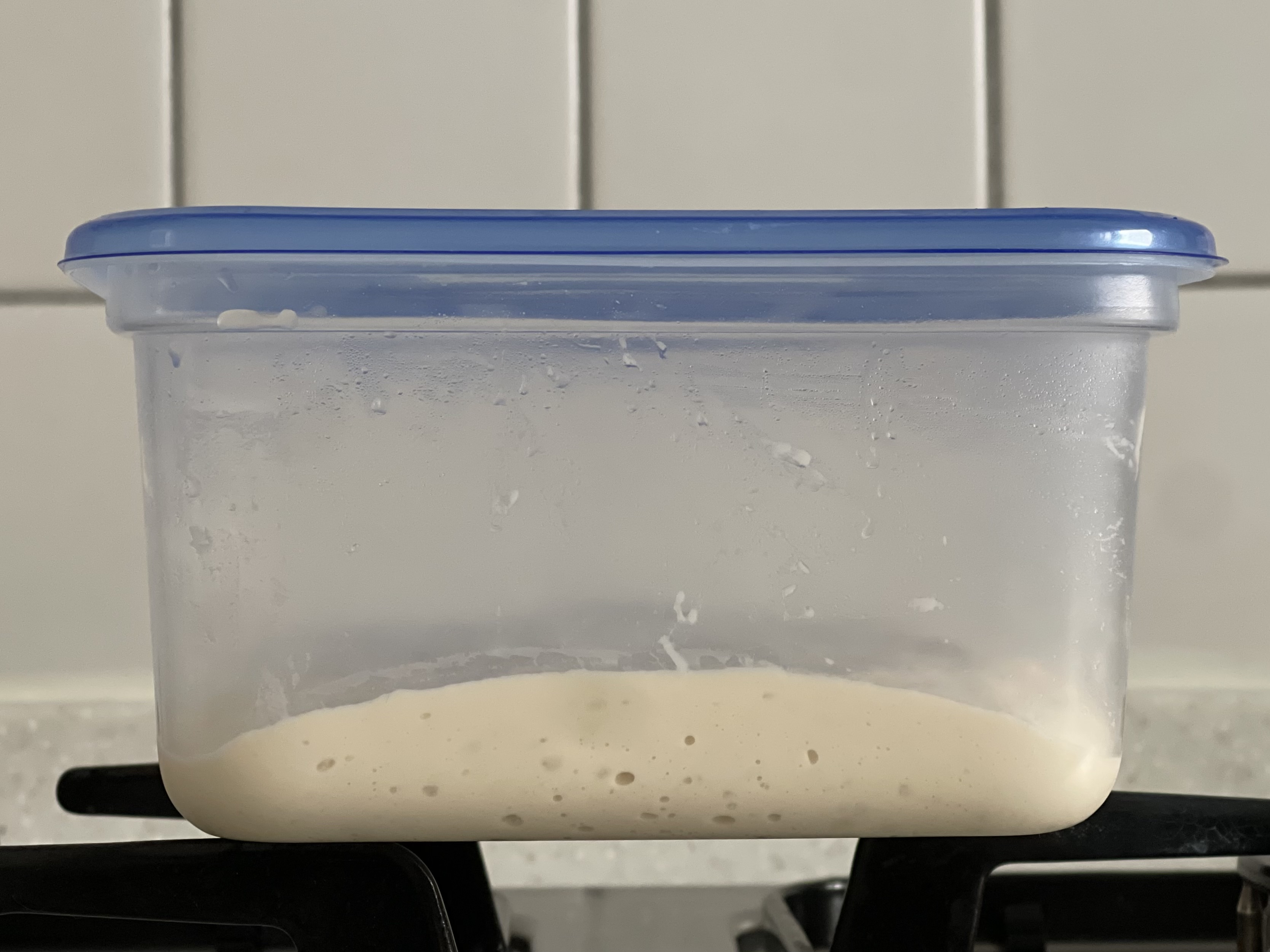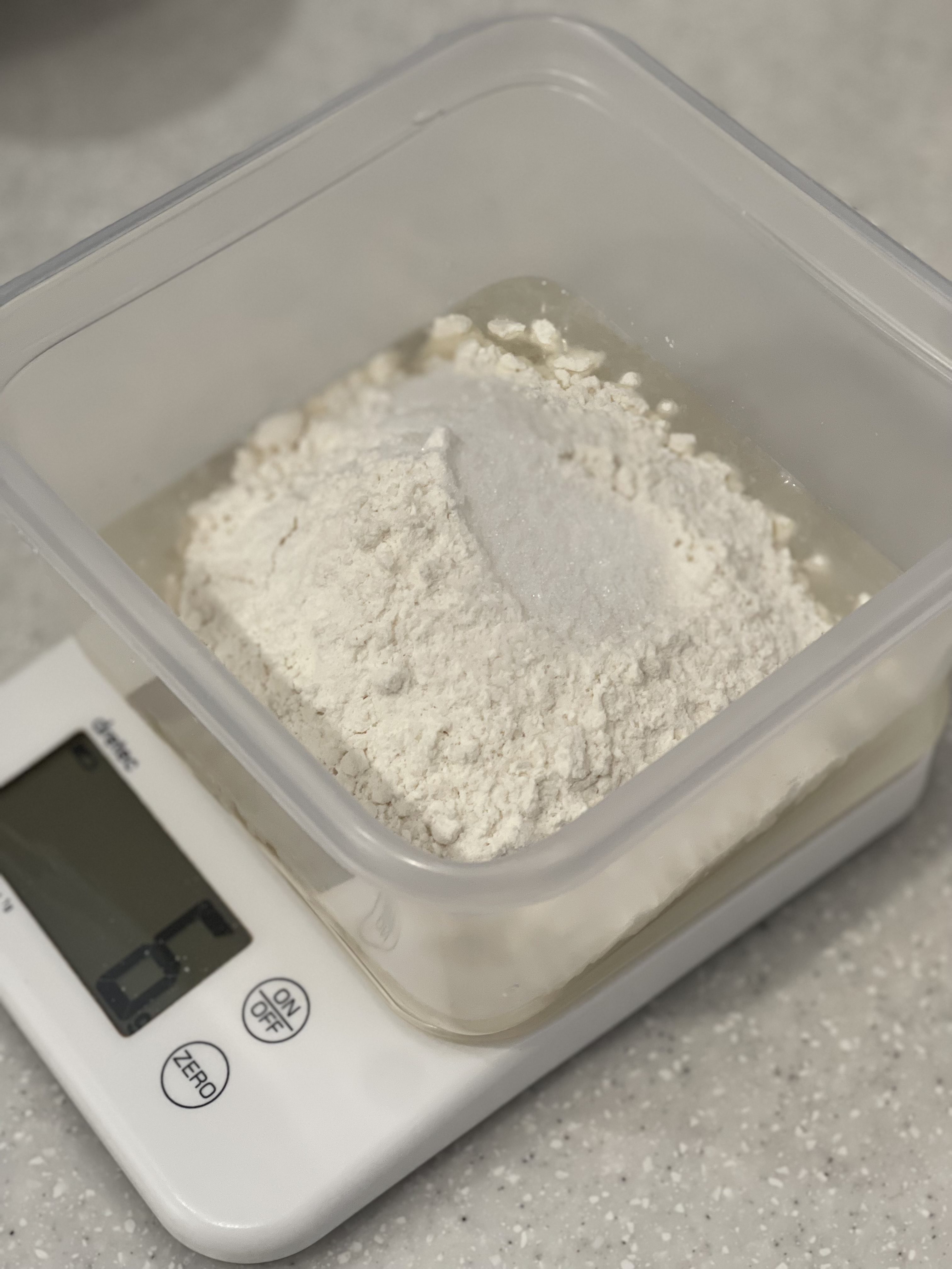 냉장고에서 약 16시간 발효. 역시 반죽량 대비 용기가 커서 발효 크기를 확인하긴 조금 어려웠다.