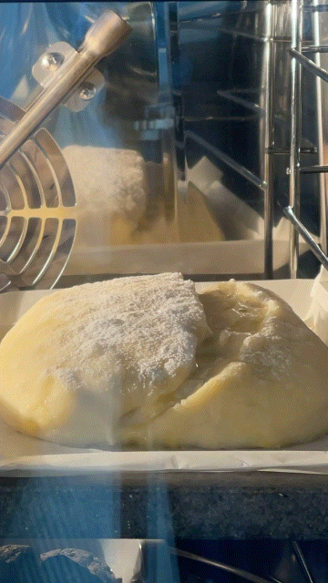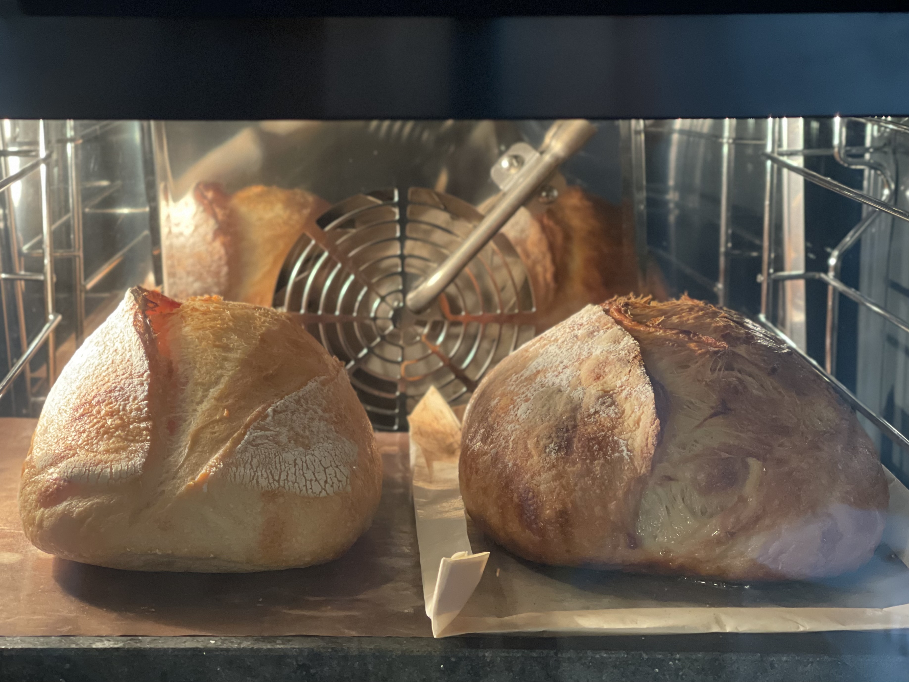 스팀을 넣고 250도에서 13분 굽고, 이후 225도로 온도를 내려 18분 더 구웠다.